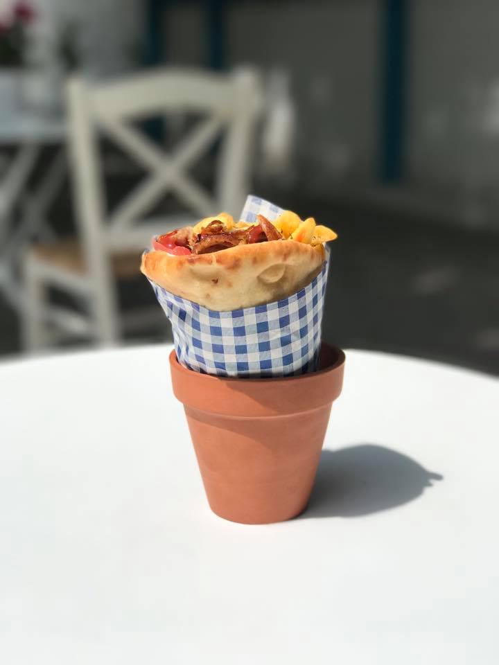 Гръцкият му вариант е гиросът, при който хлябът е по – дебел, а месото може да бъде свинско или пилешко. Едно от местата, където се предлага, е павилионът, залепен на гърба на ресторант Миконос. Там може да намерите класически гръцки питки със свински гирос, пилешко или свинско сувлаки, или с прочутата гръцка наденица луканико. Идеално място за cheat day.