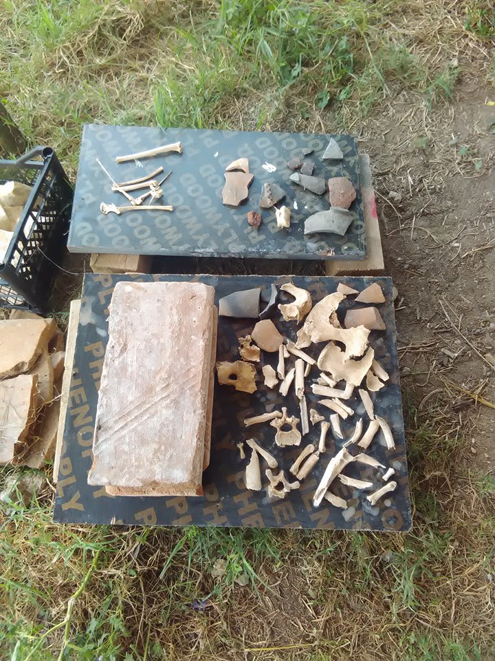 So far the entrance has not been discovered, but there are a few meters of a cob wall visible, cult pits around the mound where gifts have been laid, and a large number of Roman coins dating from the 2nd and 3rd centuries. The whole process is very time-consuming and requires careful work layer-by-layer, with shovels, brushes and spatulas, centimeter per centimeter.