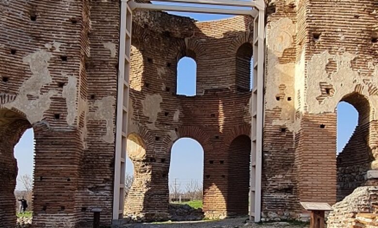 The church was built in the Early Middle Ages – V-VI century AD. Many researchers suggest that its original name was Holy Mother of God due to the widespread cult of the Mother of God during the early Byzantine period, and the name Red Church came from the typical Roman bricks and pink mortar from which it was built. The central building is in the shape of a four-leaf clover, located on the remains of another ruined building with almost the same plan. The remains are from the main part. Subsequently, more rooms were added: a double narthex, a chapel attached to it on the south side, and a baptistery on the north side. A portico with columns from the west forms the entrance of the church. The path to the latter is along a stone staircase, of which only individual blocks have been preserved. The total dimensions of the church are: length – 32.45 meters and width – 29 meters.